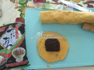 添加糯米粉和白糖,搅拌,如果太干可以加少量水。做成剂子,中间放豆沙