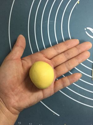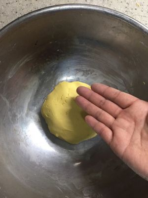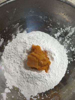 把蒸熟的南瓜捣烂,加入糯米粉揉成面团。