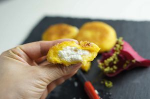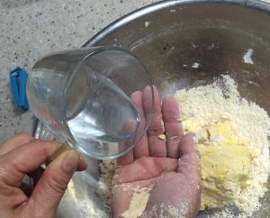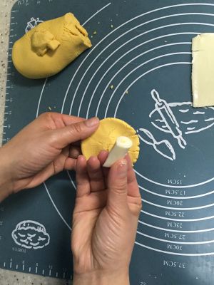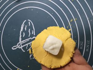 捏扁后包入马苏里拉片,新手建议包一小片,熟练的可以包两片。