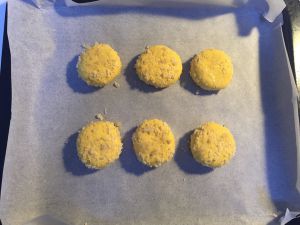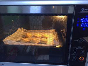 面团用工具弄成心形,放在烤盘的硅油纸上,放入烤箱上下火175度烤20分钟。