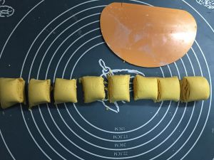 把面揉好的面团切成均等的小面团,每一个捏成底部薄两边较厚的窝放入豆沙再包起来