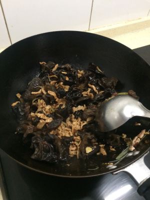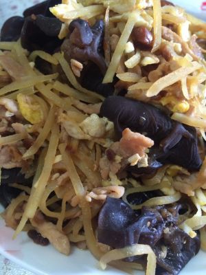 依次倒入木耳、土豆丝和鸡蛋一起翻炒均匀