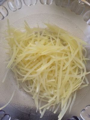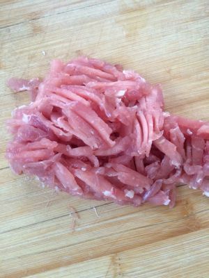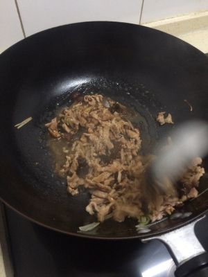 坐锅烧热注入70克菜籽油烧热 滑肉丝至全部变白 捞出肉丝 留油