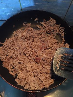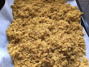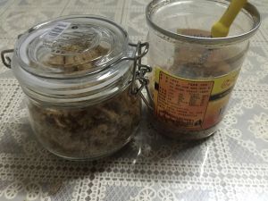 压碎后就放锅里炒,炒的时候锅里少放点油,开中火慢慢炒,炒到变金黄色就开小火放盐,棉白糖,胡椒粉,看个人口味,有宝宝的就不要放了,在炒的过程中肉会蓬松,炒到金黄色就可关火