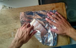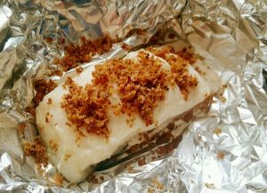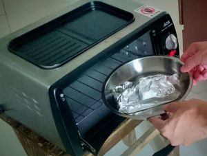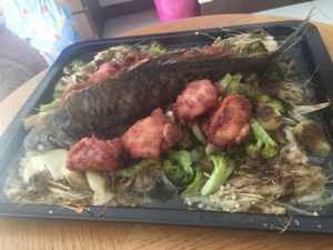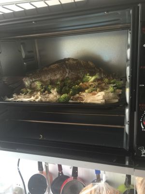 喂大约一个小时后,放入铺好锡纸的烤盘上进入烤箱(鱼大三斤,所以子鱼两吃,另一部分炖豆腐用了)