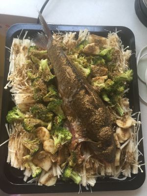 草鱼切花刀,把上述调料抹鱼身喂好,姜片葱放入鱼的花刀缝隙处以便入味