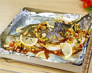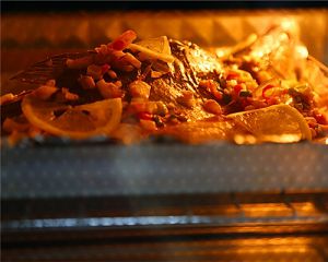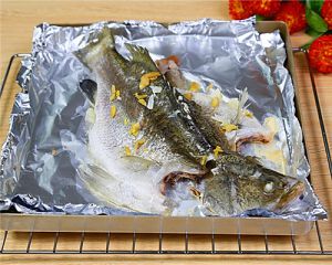 鲈鱼清理干净开花刀上滚水锅蒸6分钟,弃汁将鱼摆烤盘锡纸上