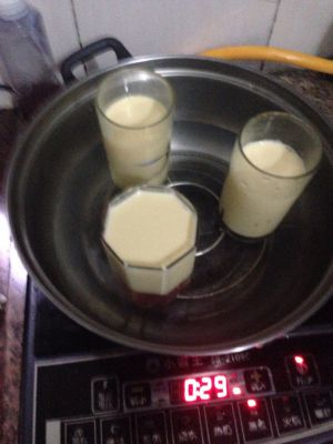 烤箱160度预热十分钟左右,烤盘加入五十度左右的热水,高度两厘米淹没瓶底。玻璃瓶放上烤盘入烤箱一百六十度烤制三十分钟。液体凝固,用力摇晃瓶子不流动轻微抖动说明烘烤成功。