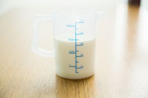 将牛奶慢慢加入蛋液搅拌均匀,一定要很慢,奶不能很烫,避免烫熟蛋液变蛋花汤。