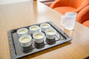 烤箱预热170度,将过筛后的液体倒入容器中,放在烤盘里。烤盘加半寸深的水,放入烤箱中层。