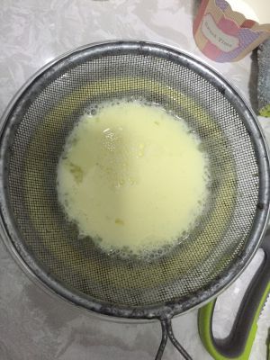 用滤网把蛋筋过滤出来,至少过滤两三遍。然后不要动他了,放一旁静置二三十分钟。这步非常重要,以免布丁烤出来都是气泡