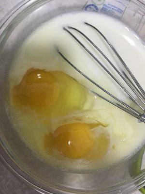 200ml牛奶+30g的糖,稍微加热,糖融化后倒入打散的鸡蛋液中搅拌均匀。
