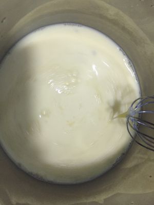 将冷却的牛奶液慢慢加入蛋液,并搅拌均匀。