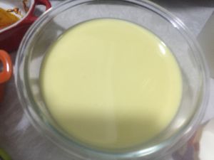 烤箱预热170度,将过筛后的液体倒入容器中,放在烤盘里。烤盘加半寸深的水,放入烤箱中层。