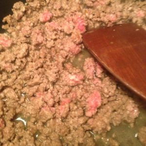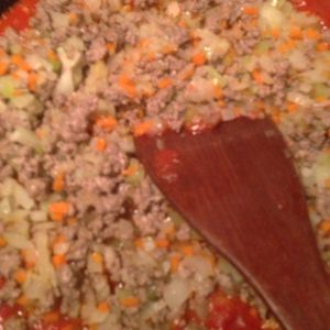 加入刚才的牛肉末和红酒继续翻炒,此时已经满厨房飘香了