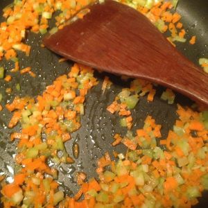 锅子刷干净后,倒入油,将芹菜,胡萝卜,洋葱丁一起倒入翻炒