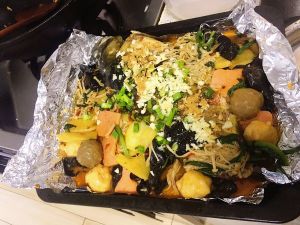 烤箱先预热10分钟,上下火210°,同时把煸炒好的洋葱和芹菜平铺到放好锡纸的烤盘,然后把炖好的菜和鱼慢慢盛到烤盘里