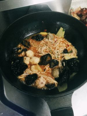 鱼烤熟放在盘子里,然后开始炒料,在锅里放入色拉油加入干辣椒段和郫县豆瓣和酱油老干妈炒一下加入适量的水,在把先把泡好的木耳和花菜先先放进锅里煮一下,因为他们不容易煮熟,煮一会在加入藕、土豆、洋葱、芹菜、新鲜小辣椒,姜,蒜、莴笋、黄瓜,煮熟直接淋在烤鱼上面就OK啦