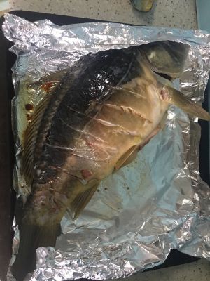 端入预热好的烤箱,小心烫,因为烤箱此刻是热的,拿工具和手套端放进去,继续烤10-15分钟,想吃泡饼的可以在此步骤放入切好的大饼,塞到鱼身下面