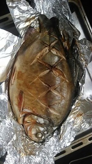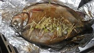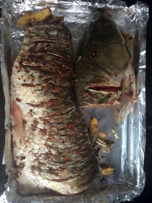 蒸鱼豆豉油或生抽抹满鱼身,调料粉均匀抹好,把鱼刷满油。烤箱提前预热,放入烤箱烤,220度20分钟。视鱼的大小调时间。