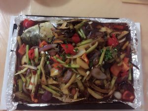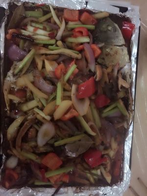 将炒好的料铺到鱼上,再放入烤箱,烤5分钟。我因为要等客人来齐,所以180度烤了10分钟