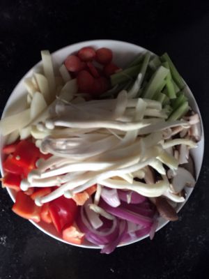 香菇,白雪姑,土豆,芹菜,胡萝卜,洋葱,红椒等蔬菜切好备用