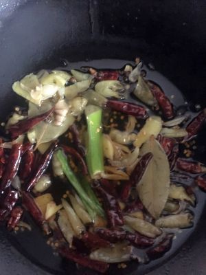 油锅烧热,葱姜蒜,辣椒,花椒,香叶,泡椒爆香