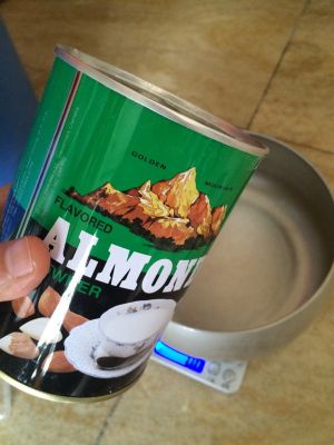 小锅放去皮南杏仁50g、淡奶油150ml、杏仁露饮料3罐,以小火加热,轻轻搅拌,注意不要沸腾。