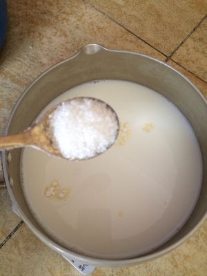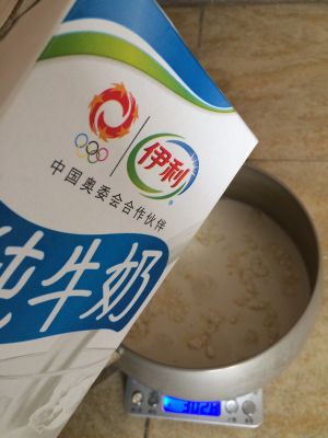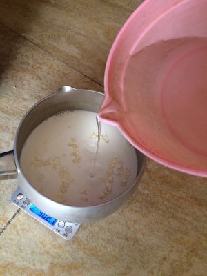 剩下的110ml纯牛奶和杏仁露,细砂糖全部称重(食材提前称重,不然来不及,锅里的牛奶会糊)