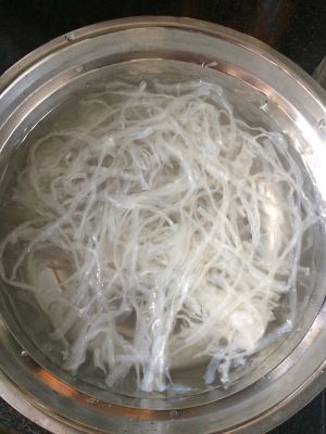 取一干净大碗,把琼脂放在冷水中浸泡至软。