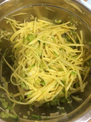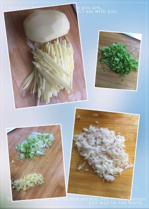 土豆切丝,白萝卜、洋葱切丁,大葱和姜切碎