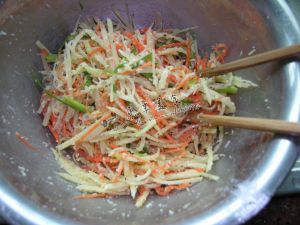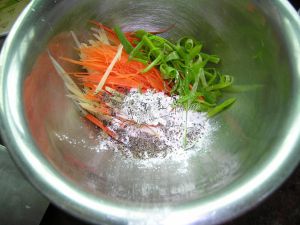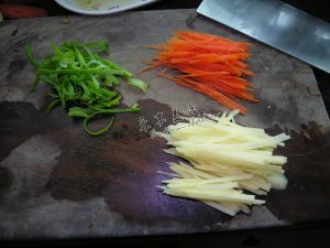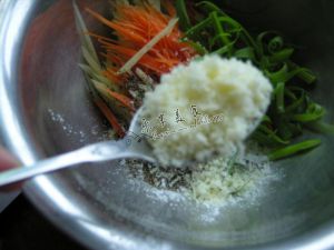 将土豆丝,胡萝卜丝,葱丝放入容器中,加入生粉