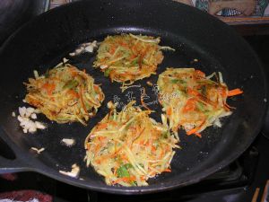 土豆擦丝儿,葱姜胡椒粉盐,鸡蛋,面粉少量。拌匀。