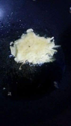 锅里放油,待油温热后,小火,用筷子夹拌好土豆丝放入锅里,用铲子摊平,小火煎炸,一面好后进行翻面。(因为鸡蛋液可能会导致和淀粉在一起时会有积水,这时放完土豆后浇在上面就可以)。