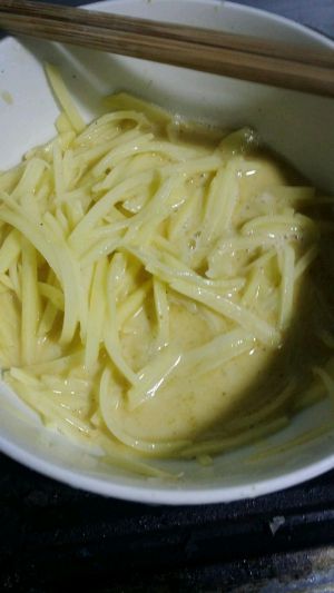 土豆切丝,打上一个鸡蛋,放上三勺淀粉,半勺盐,十三香,鸡精,如果喜欢可以用手搅拌~