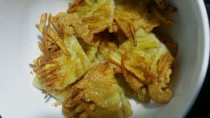 上桌前再复炸一次即可,美味的炸藕盒炸土豆饼出锅啦!
