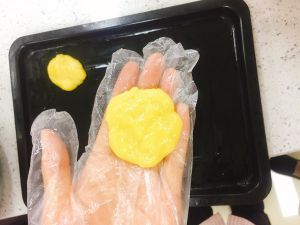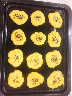 揪取16g左右的面剂揉成小球,压扁后,凉面蘸满芝麻放入烤盘中 烤箱预热,180度烤制18分钟左右