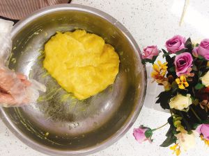 晾凉的低粉擀碎后倒入容器,放入盐、糖、小苏打拌匀