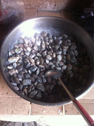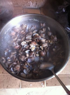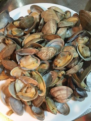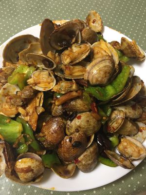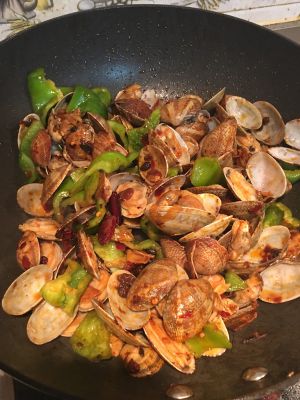 热油下锅 依次将姜、蒜、辣椒倒入翻炒后,将花蛤倒入锅中。 用淀粉和生抽勾芡收汁
