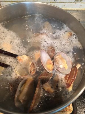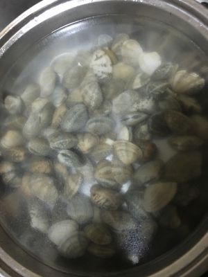 倒入花蛤,大火翻炒,盖上锅盖,让其张嘴