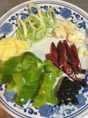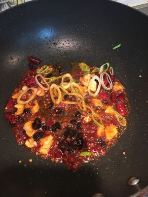 底油,依次顺序:姜蒜、干红辣椒、豆瓣酱炒至红油、豆豉及葱花,翻炒片刻