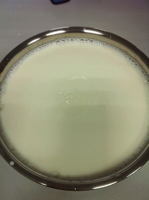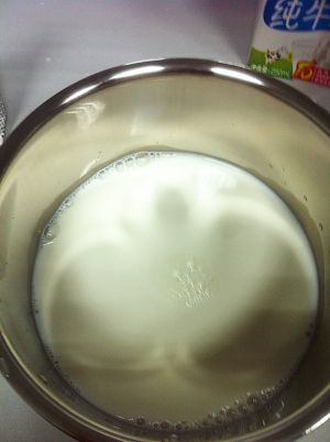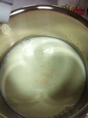 取一个大一点的容器,同样也是干净无油无生水,倒入牛奶再倒入发酵剂。