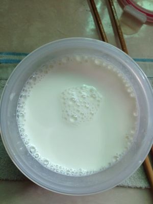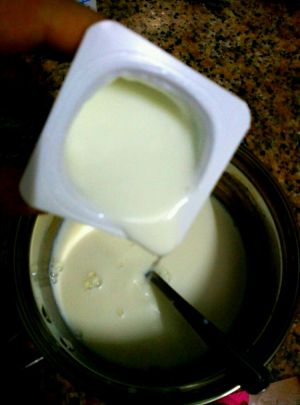 牛奶出锅,加入一杯酸奶搅拌均匀