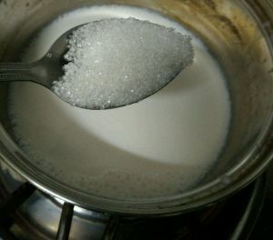 牛奶放入锅里,再放3勺白糖加热至白糖融化(不需把牛奶煮开)