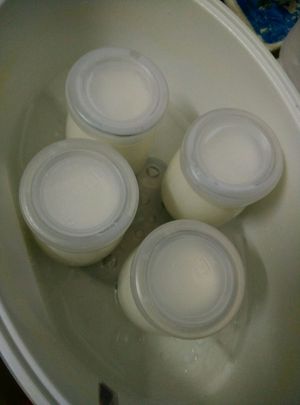搅拌均匀后。倒入已消毒好的瓶子里,酸奶机加入1cm的水,把瓶子整齐摆放在酸奶机中