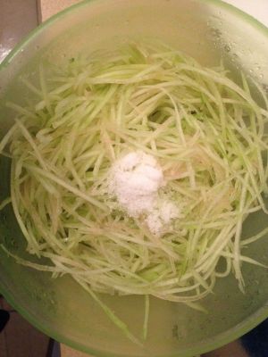 先放点盐腌制30分钟。把腌制出的水分倒掉。