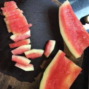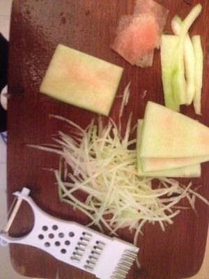 先削去外层的硬皮,再片去内层的红瓤!现在的西瓜都改良过了,皮都很薄,所以红瓤剩了点,话说现在谁也不希望买到厚皮西瓜啊!