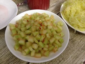 西瓜皮去掉外皮洗净后切丁, 图片有刨丝的是因为我的西瓜皮比较多所以在同时做另一种做法。