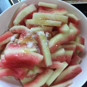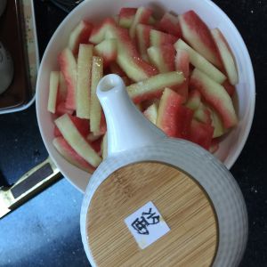 西瓜皮去掉绿皮和红壤,用淡盐水掩上。