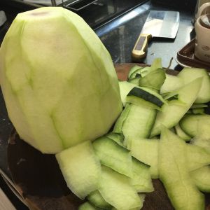 用刮皮刀,去皮,要多去一点,绿色外皮比较硬不好吃。